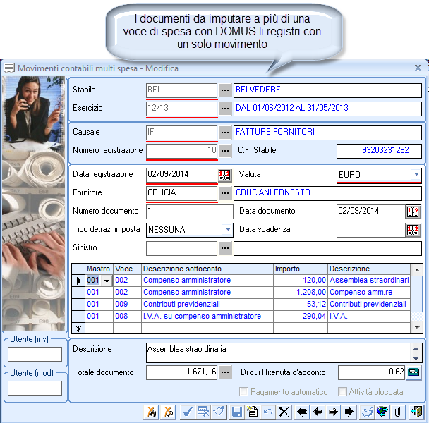 Grazie alle nostre collaborazioni il documento immesso in prima nota può divenire digitale e essere richiamato o ricercato nell’archivio digitale con un semplice click del mouse! I documenti da imputare a più di una voce di spesa con DOMUS li registri con un solo movimento utilizzando la