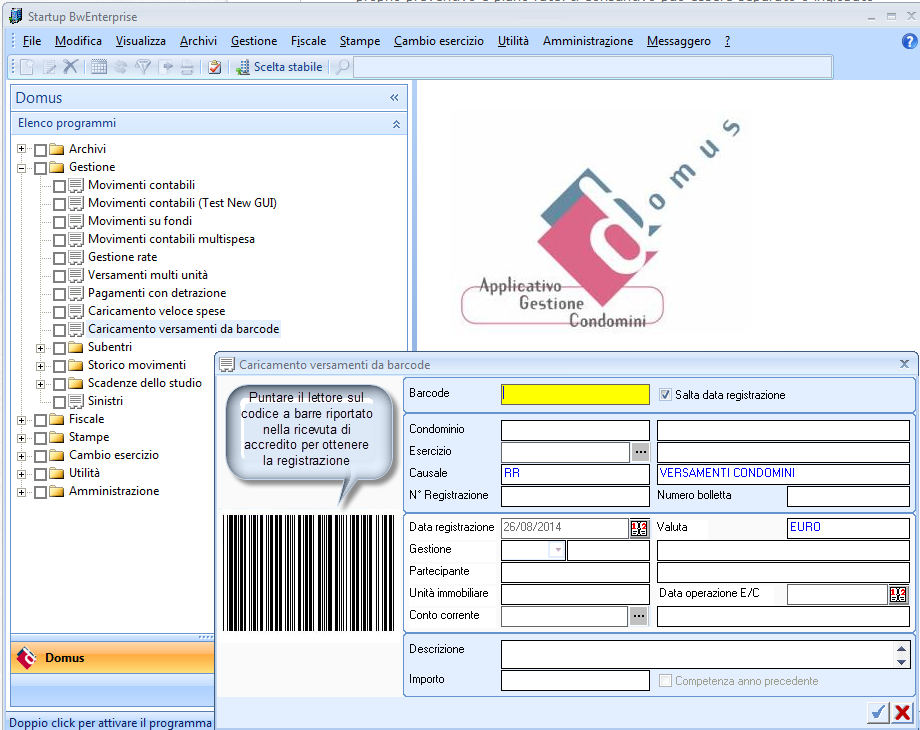 - con l’Acquisizione degli incassi estratti da home banking, oppure mediante lettura codice a barre in caricamento versamenti da barcode, ottieni la registrazione di tutti i versamenti dei condòmini;